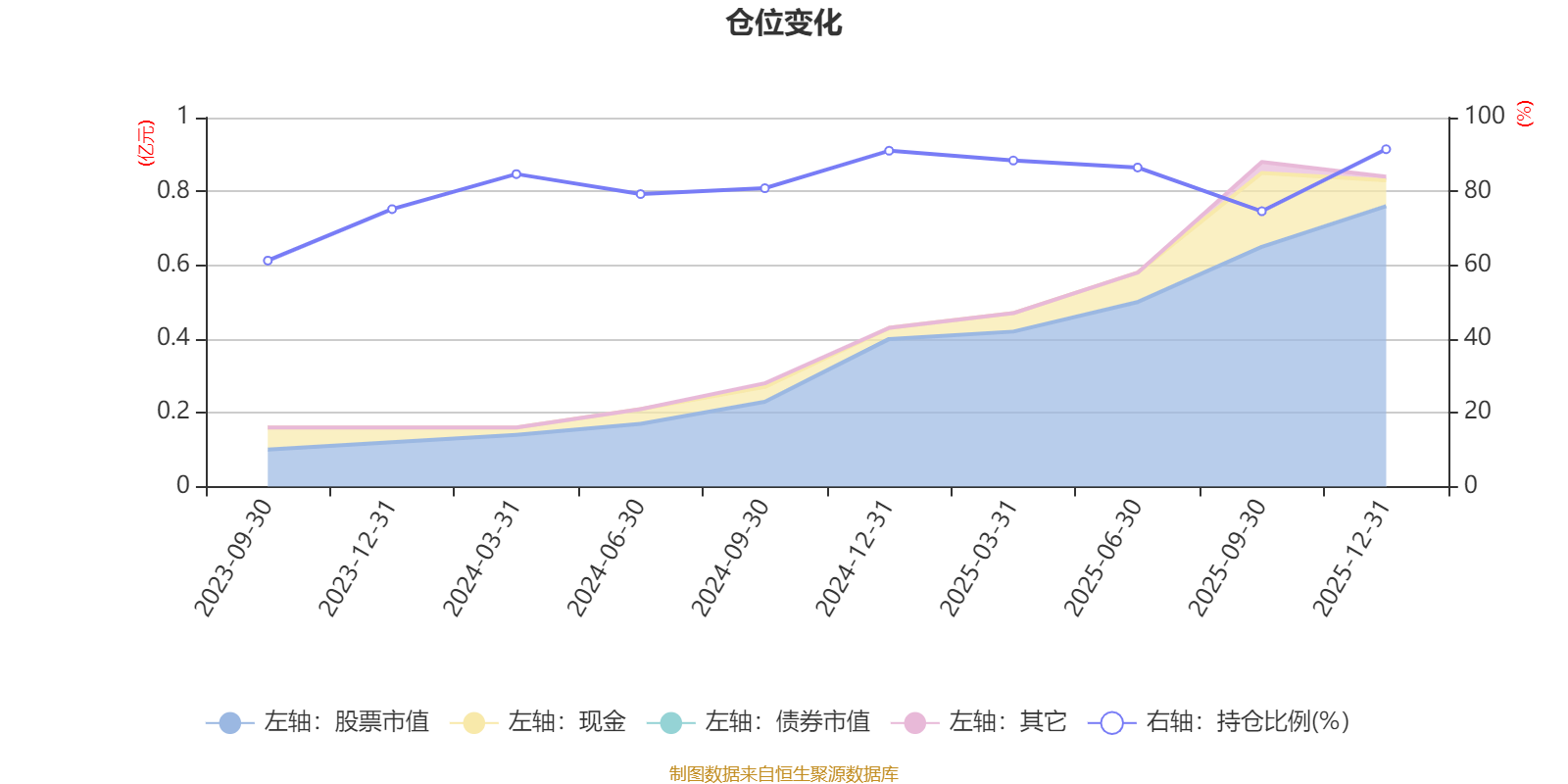据定期报告数据统计,成立以来平均股票仓位为81.32%,同类平均为86.9%。2025年末基金达到91.43%的最高仓位,2023年三季度末最低,为61.25%。