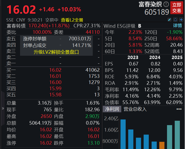 个股方面,富春染织涨停,公司一季度预计实现归母净利润7000万元至8000万元,同比大幅增长1347.69%至1554.5%。