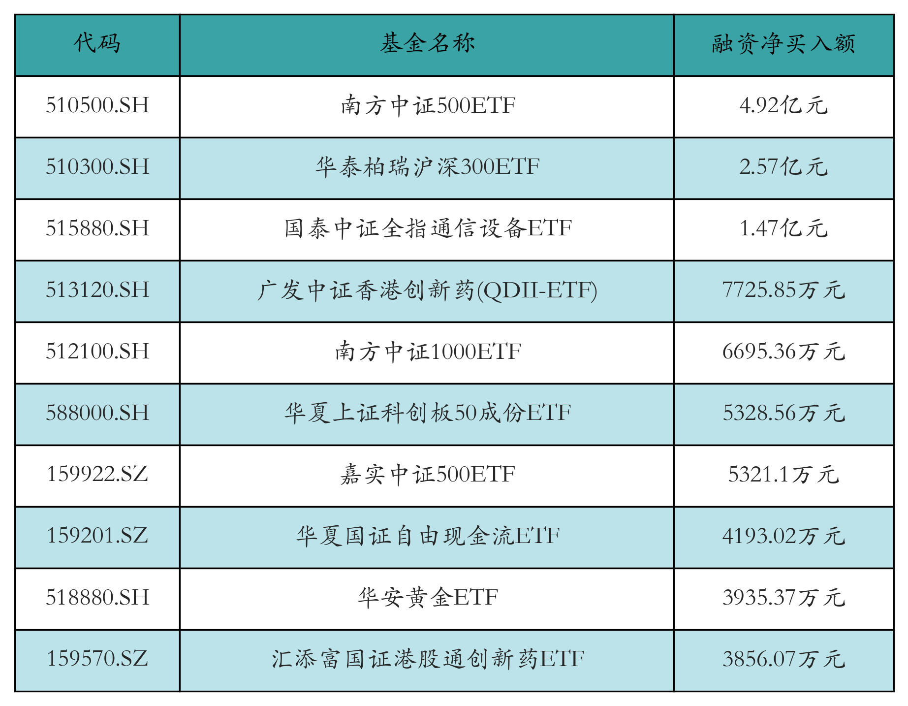 4月8日ETF融资净买入额前三位分别为:南方中证500ETF(4.92亿元)、华泰柏瑞沪深300ETF(2.57亿元)和国泰中证全指通信设备ETF(1.47亿元),前10具体见下表: