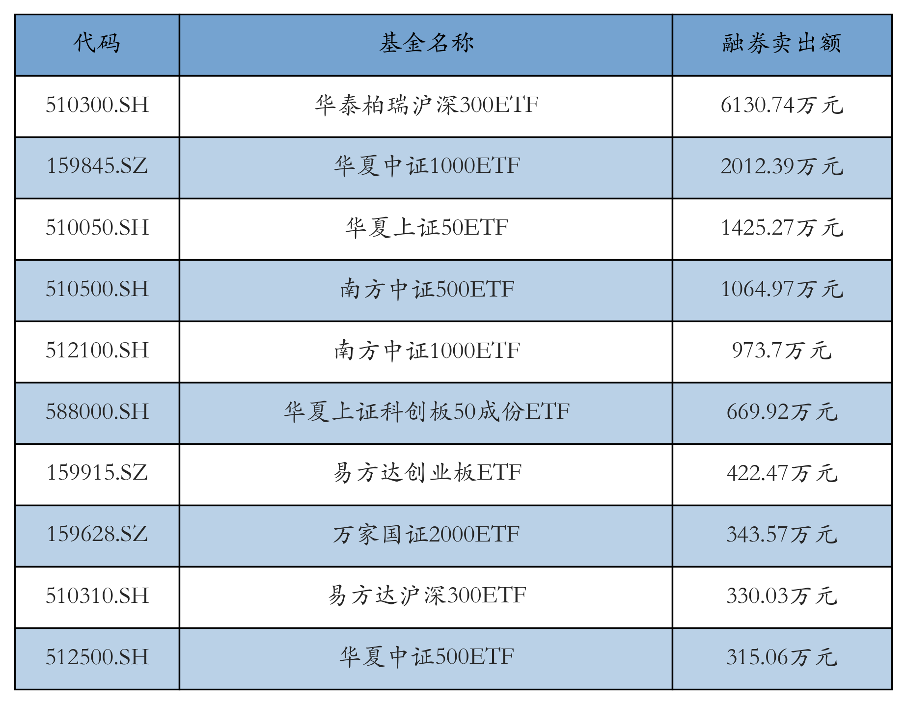 4月8日ETF融券卖出额前三位分别为:华泰柏瑞沪深300ETF(6130.74万元)、华夏中证1000ETF(2012.39万元)和华夏上证50ETF(1425.27万元),前10具体见下表: