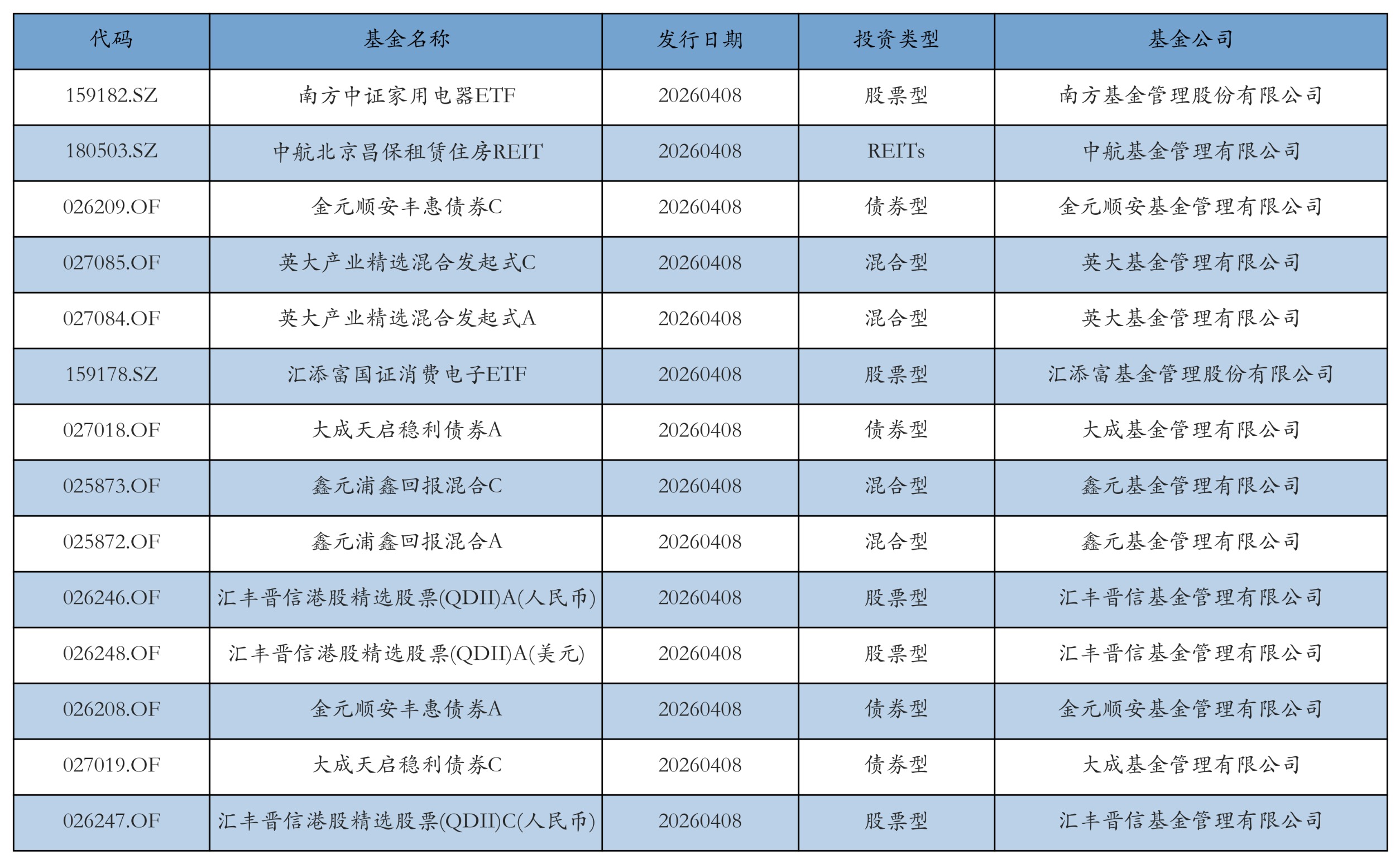 昨日有14只新基金发行,分别为:南方中证家用电器ETF、中航北京昌保租赁住房REIT、金元顺安丰惠债券C、英大产业精选混合发起式C、英大产业精选混合发起式A、汇添富国证消费电子ETF、大成天启稳利债券A、鑫元浦鑫回报混合C、鑫元浦鑫回报混合A、汇丰晋信港股精选股票(QDII)A(人民币)、汇丰晋信港股精选股票(QDII)A(美元)、金元顺安丰惠债券A、大成天启稳利债券C、汇丰晋信港股精选股票(QDII)C(人民币),详情见下表: