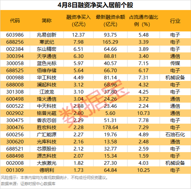 兆易创新融资净买入额居首,当日净买入12.37亿元;其次是寒武纪、东山精密,融资净买入金额分别为7.98亿元、6.51亿元。融资净买入金额居前的还有天孚通信、蓝色光标、佰维存储等。
