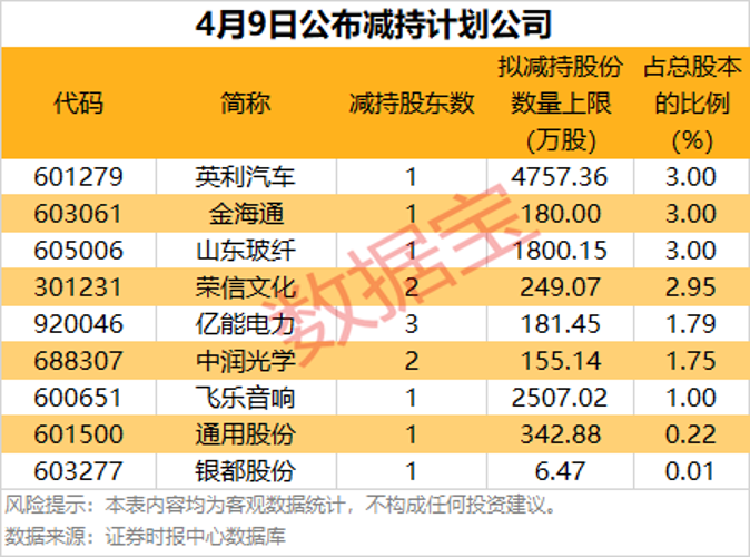 4月9日,9家公司发布了减持计划,拟减持比例居前的有英利汽车、金海通、山东玻纤等。