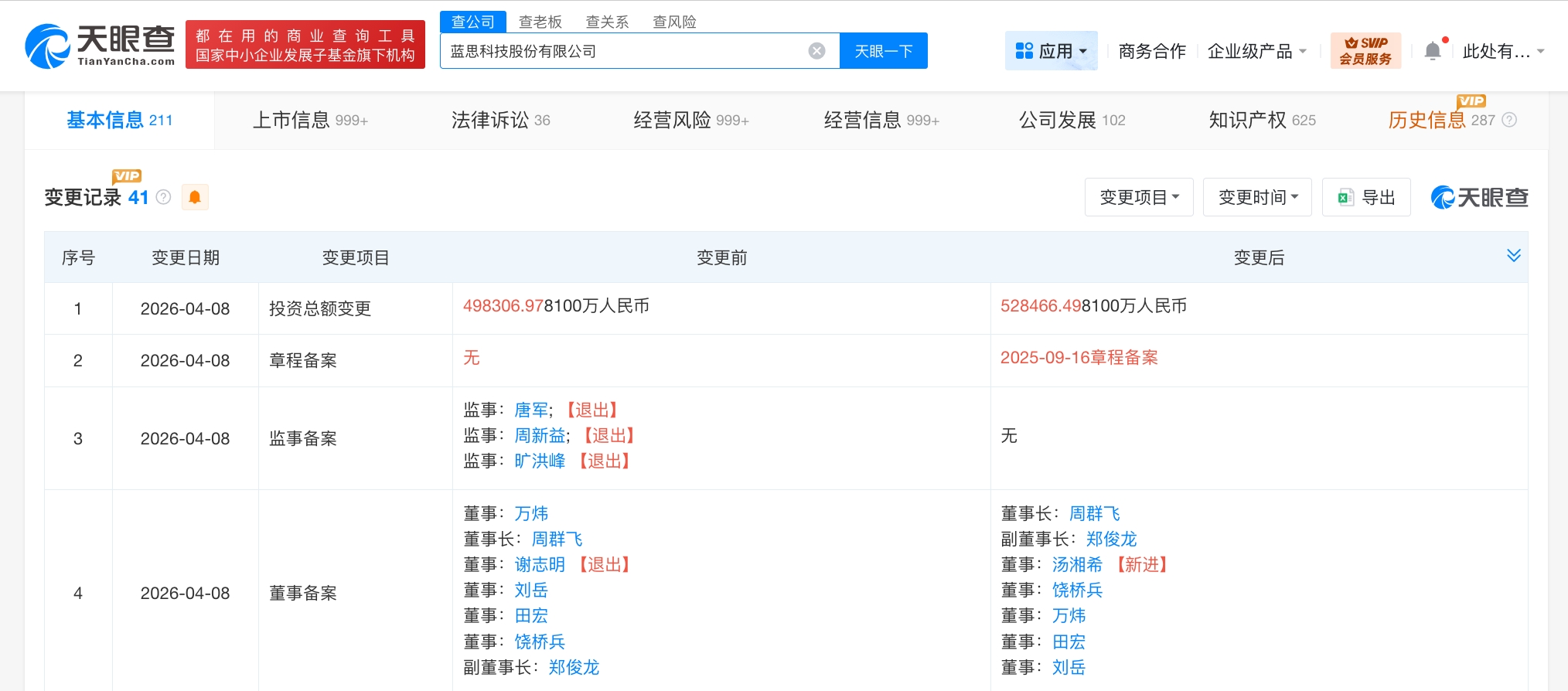 南方财经4月9日电,天眼查工商信息显示,近日,蓝思科技股份有限公司发生工商变更,注册资本由约49.8亿人民币增至约52.8亿人民币,增幅约6%。该公司成立于2006年12月,法定代表人为周群飞,经营范围包括光学玻璃制造、电子元器件制造、智能车载设备制造等。股东信息显示,该公司由蓝思科技(香港)有限公司、长沙群欣投资咨询有限公司等共同持股。