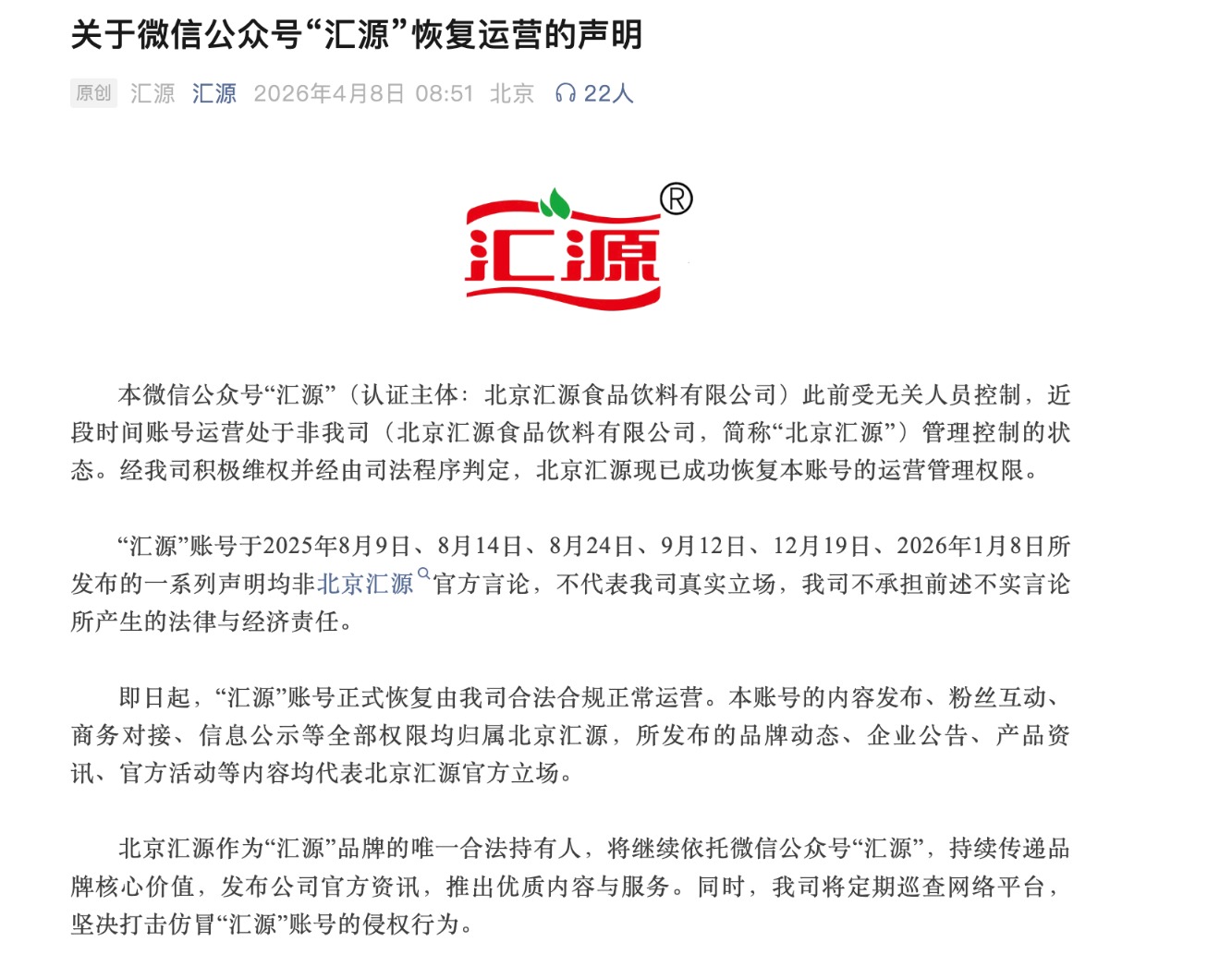 4月8日,北京汇源食品饮料有限公司(以下简称“北京汇源”)发布声明,宣布经过积极维权并经由司法程序判定,北京汇源现已成功恢复微信公众号“汇源”的运营管理权限。即日起该账号由北京汇源合法合规正常运营,同时线上电商等核心业务板块也同步恢复正常运转。历经内部管控风波后,汇源正式回归正常经营轨道。