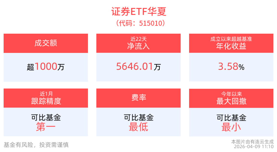 跟踪精度方面,截至2026年4月8日,证券ETF华夏近1月跟踪误差为0.004%,在可比基金中跟踪精度最高。
