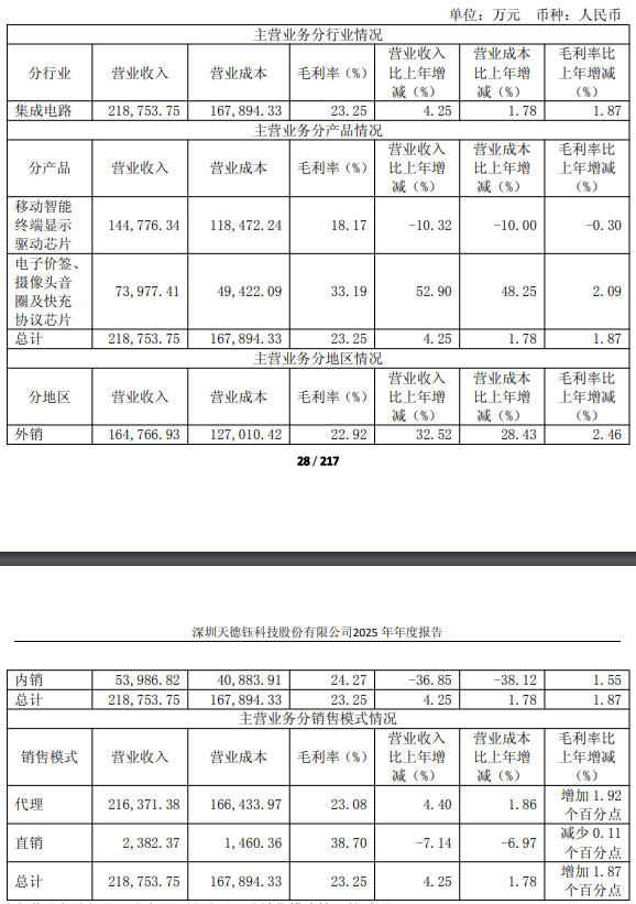 分产品来看,2025年移动智能终端显示驱动芯片主营业务收入14.48亿元,较上年同期降低10.32%,主营业务成本较上年同期降低10.00%;电子价签、摄像头音圈及快充协议芯片主营业务收入7.4亿元,较上年同期增长52.90%,主营业务成本较上年同期增长48.25%。