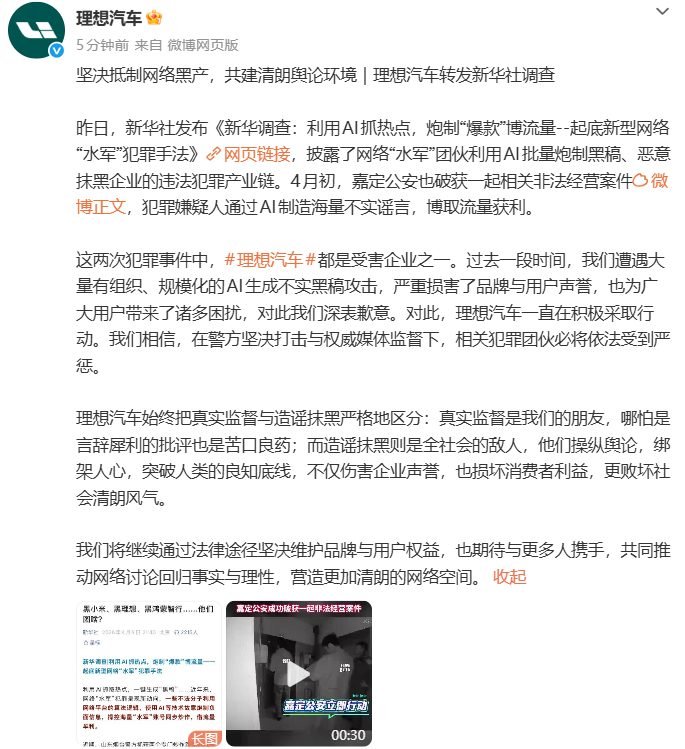 【大河财立方消息】4月9日,理想汽车转发新华社文章,并配文称坚决抵制网络黑产,共建清朗舆论环境。