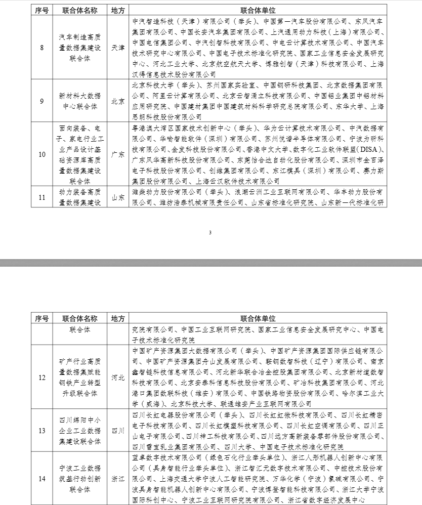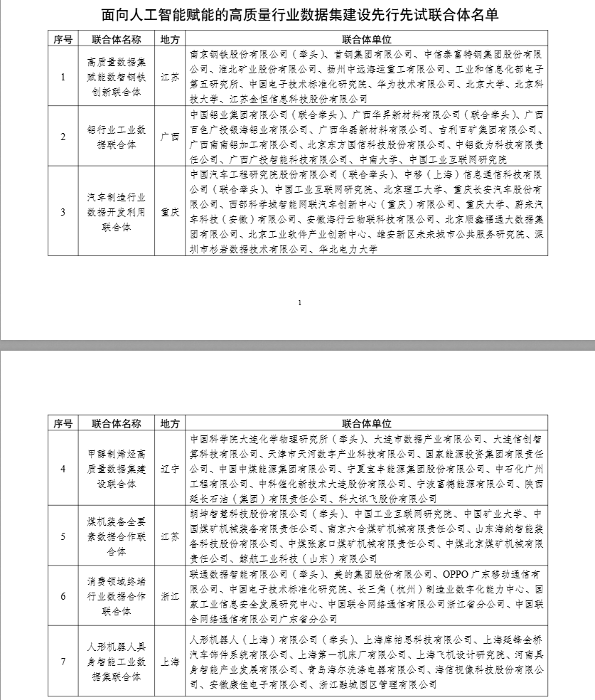 工业和信息化部办公厅公布面向人工智能赋能的高质量行业数据集建设先行先试联合体名单