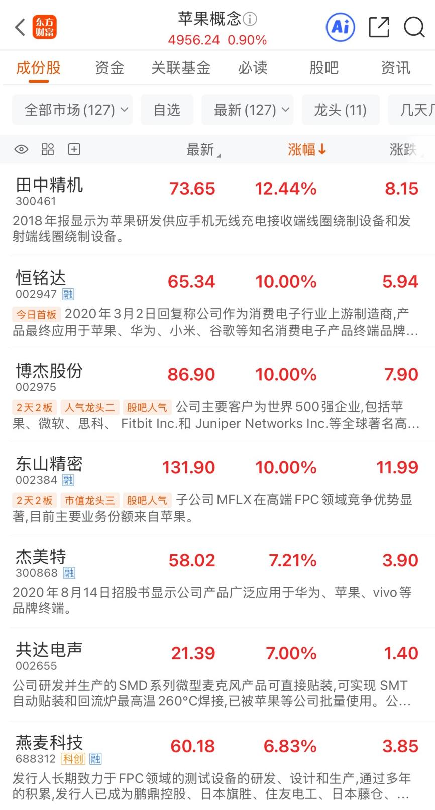 4月9日,苹果概念低开高走多股涨停,截至早间收盘,板块上涨0.9%,涨幅居市场概念板块前列。个股方面,田中精机涨超12%,恒铭达、博杰股份、东山精密涨停,杰美特、共达电声涨超7%,燕麦科技、超声电子、大族激光、光大同创涨超6%,光韵达、水晶光电涨超5%。