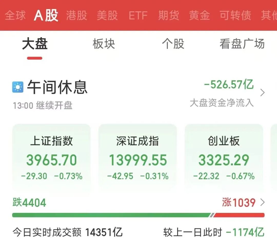 4月9日,A股三大指数集体低开。沪指、创业板指均跌超0.5%,深成指盘中一度翻红。沪深两市半日成交额1.43万亿,较上个交易日缩量4466亿。盘面上热点较为杂乱,全市场超4400只个股下跌。