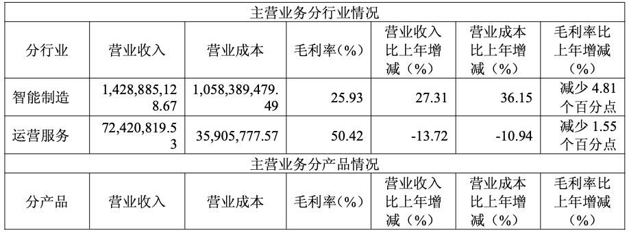分行业来看,报告期内,智能制造业务营业收入较上年同比增长27.31%,毛利率为25.93%,同比减少4.81个百分点。运营服务营业收入较上年同比减少13.72%,毛利率为50.42%,同比减少1.55个百分点。