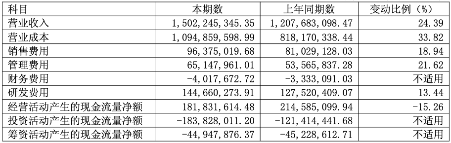 报告期内,公司营业成本1,094,859,598.99元,同比增长33.82%,销售费用、管理费用、研发费用均同比增长。