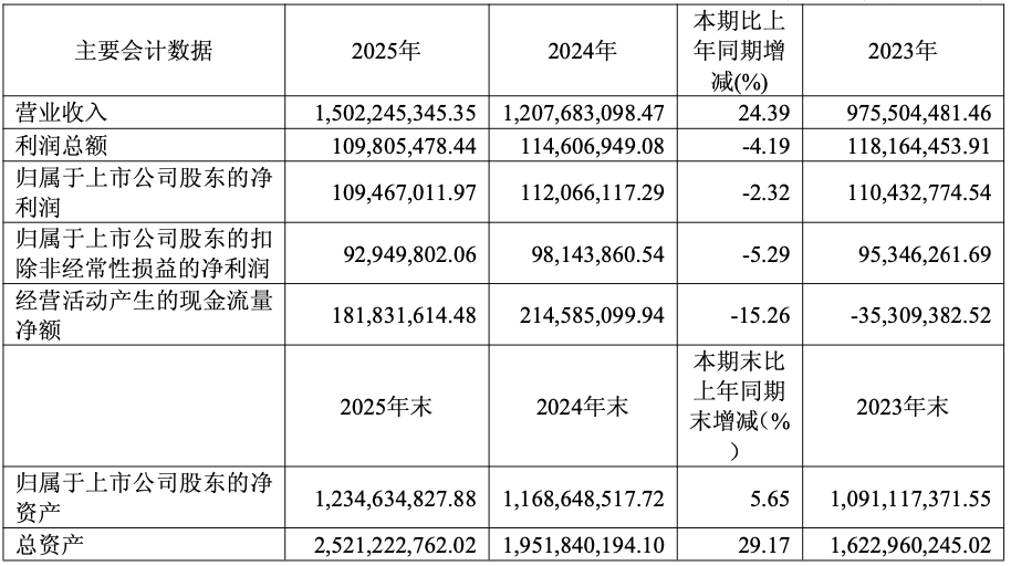 2025年,公司实现营业总收入15.02亿元,同比增长24.39%;归母净利润1.09亿元,同比下降2.32%;扣非净利润9294.98万元,同比下降5.29%;经营活动产生的现金流量净额为1.82亿元,同比下降15.26%;报告期内,兰剑智能基本每股收益为1.07元,加权平均净资产收益率为8.92%。公司2025年度分配预案为:拟向全体股东每10股转4.5股,派现3.3元(含税)。