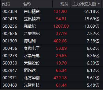 Wind实时监测数据显示,继昨日大幅流入之后,今日主力资金继续大幅流入电子行业,截至午间收盘,电子获得逾209亿元主力资金净流入,遥遥领先其他行业。其中东山精密获得逾61亿元净流入,立讯精密、寒武纪均获得超10亿元净流入。