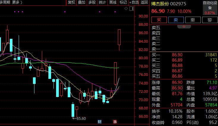 消费电子概念股早间全线走强,苹果概念方向领涨,博杰股份(002975)开盘仅约9分钟直线涨停,连续第2日封板,哈森股份则在临近午间收盘涨停,田中精机、恒铭达等涨停或涨超10%,并创历史新高(复权,下同)。