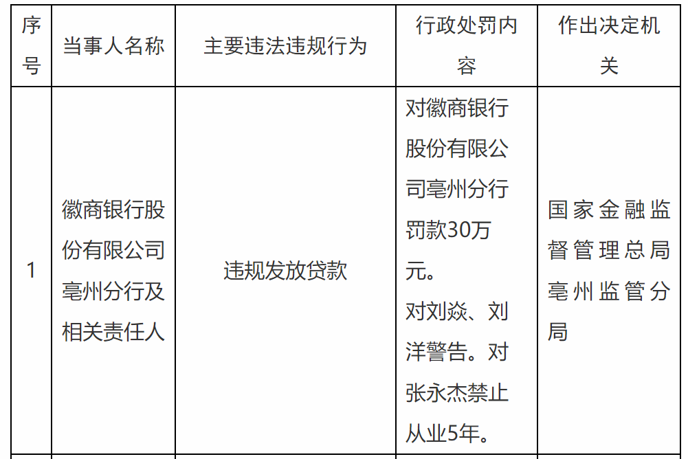 处罚信息显示,徽商银行股份有限公司亳州分行的主要违法违规行为是:违规发放贷款。国家金融监督管理总局亳州监管分局对其罚款30万元;对刘焱、刘洋警告;对张永杰禁止从业5年。