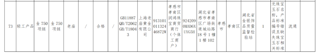 抽检结果显示,1批次标称孝感市孝南区润鸿珠宝商贸商行(个体工商户)受检的“老庙金750项链”被检出不合格,不合格项目为无珠宝玉石名称,产品标准编号错误且缺失珠宝玉石相关标准,生产企业为上海老庙黄金有限公司。