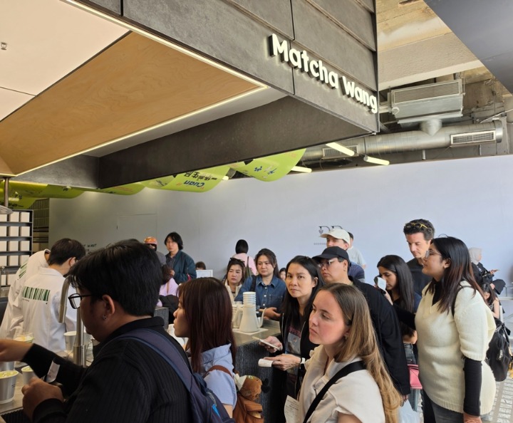 下午2时,位于上海淮海中路商圈的Matcha Wang门店前,长长的队伍一路蜿蜒,空气中弥漫着抹茶的微苦与奶盖的甜香。金发碧眼的欧美游客、轻声细语的东南亚面孔、妆容精致的韩国年轻人交织在一起,不时踮起脚尖朝柜台里张望,高高举起的手机对准柜台内正在制作的“小羊抹茶”饮品。身穿白大褂的店员屏息凝神,在绵密的奶泡上勾勒出一只只黑面小羊,圆滚滚的身体慵懒地卧在“青草地”上,软萌可爱、栩栩如生。