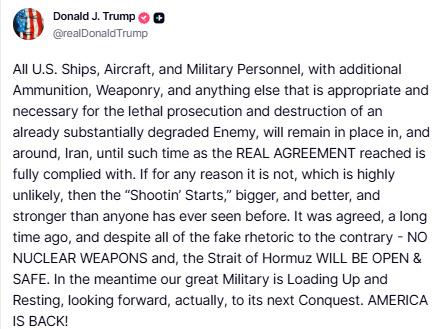 中新网4月9日电当地时间4月8日,美国总统特朗普在社交媒体上发文称,“所有美国舰船、飞机及军事人员,连同额外弹药、武器以及任何其他适当且必要的物资,将继续驻扎在伊朗境内及其周边地区,直到达成的协议得到全面遵守。”