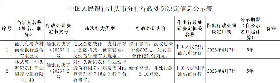 【大河财立方消息】4月8日,中国人民银行汕头市分行披露的行政处罚决定信息显示,因违反金融统计、支付结算、金融科技、征信管理、反洗钱管理有关规定,汕头海湾农村商业银行被警告,没收违法所得892元,处罚款合计127.91万元。林某辉对违反支付结算管理有关规定的行为负有责任,被警告,并处罚款5.16万元。