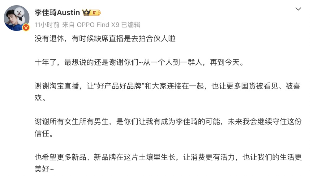 对此,李佳琦于当日深夜发文否认“退休”的说法,称有时缺席直播是去拍《巴黎合伙人》。他还在评论区表示,活动上他口误了,缺席直播是两个月,而非两个季度,且第一个月已经拍摄结束,《巴黎合伙人》也即将和大家见面。
