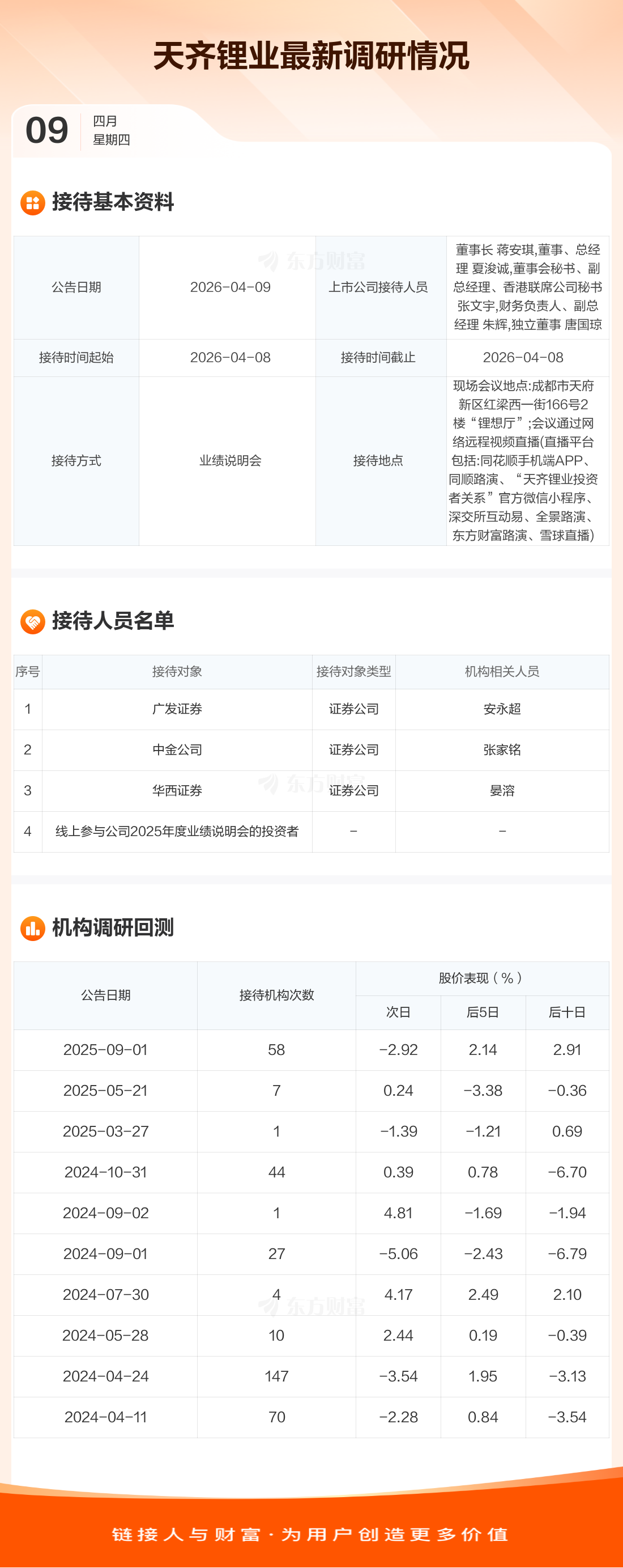 天齐锂业4月9日公告称,4月8日接待广发证券等4家机构调研。接待人员包括董事长 蒋安琪,董事、总经理 夏浚诚,董事会秘书、副总经理、香港联席公司秘书 张文宇,财务负责人、副总经理 朱辉,独立董事 唐国琼。