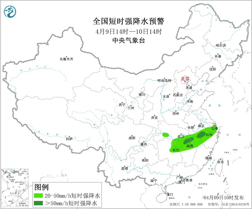 预计4月9日14时至10日14时,江南北部、河北西北部等地的部分地区将有8级以上雷暴大风或冰雹天气,其中,安徽南部、湖南东北部、江西北部等地的部分地区将有10级以上雷暴大风,最大风力可达11级以上,局地不排除出现龙卷的可能性;江南北部等地的部分地区将有小时雨量大于20毫米的短时强降水天气,其中,安徽南部、江西北部等地的部分地区小时雨量大于50毫米。