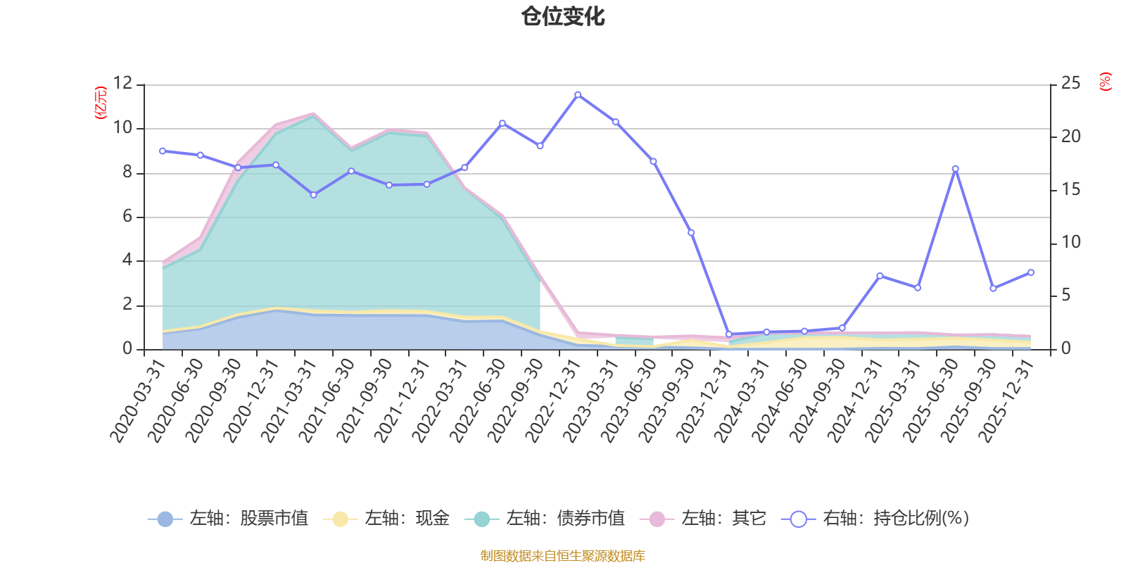 据定期报告数据统计,近三年平均股票仓位为8.32%,同类平均为19.2%。2022年末基金达到24.03%的最高仓位,2023年末最低,为1.43%。