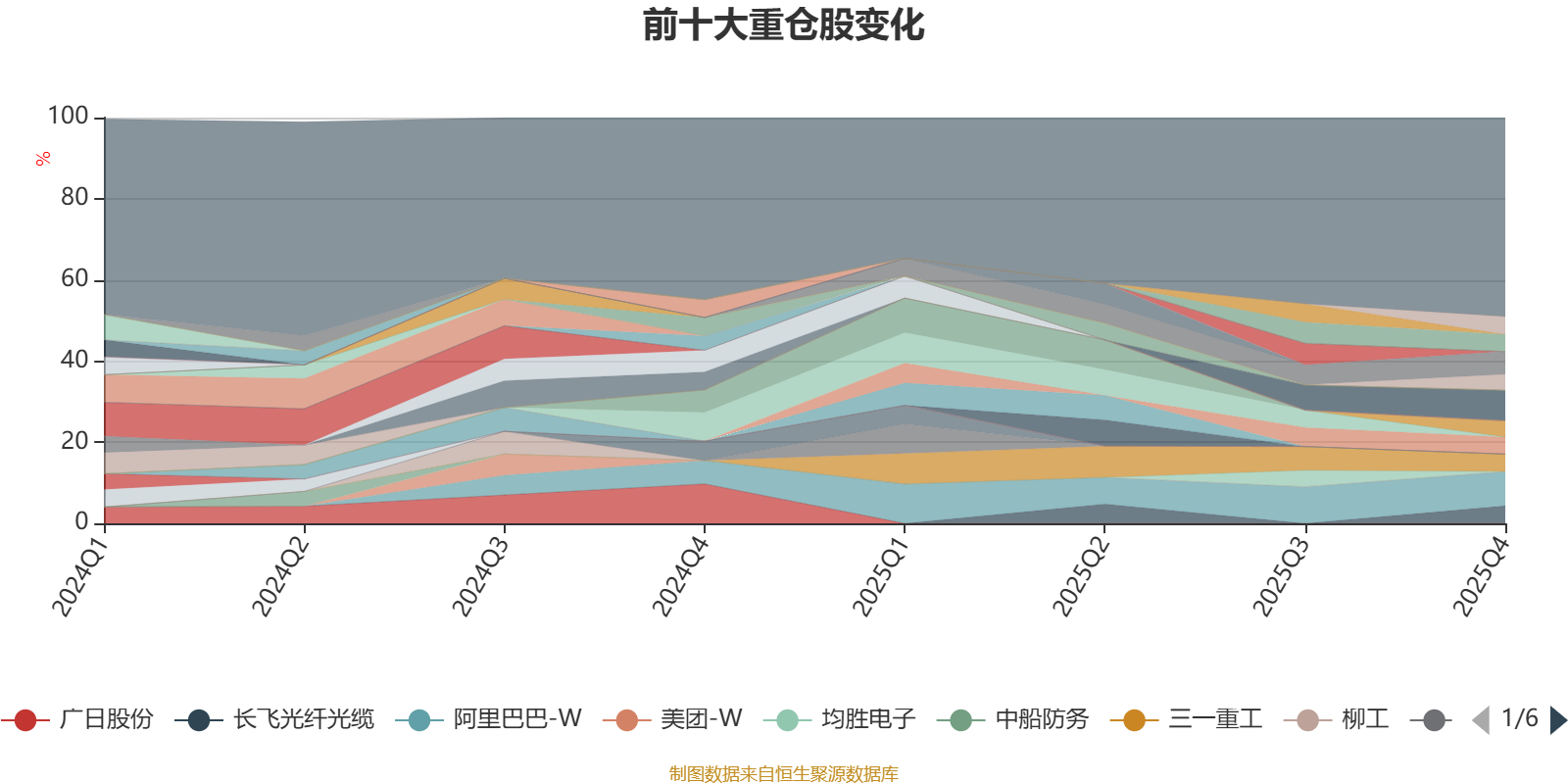 截至2025年末,基金十大重仓股分别是阿里巴巴-W、应流股份、腾讯控股、大连重工、长飞光纤光缆、三一重工、金风科技、上海复旦、菲利华、福昕软件。