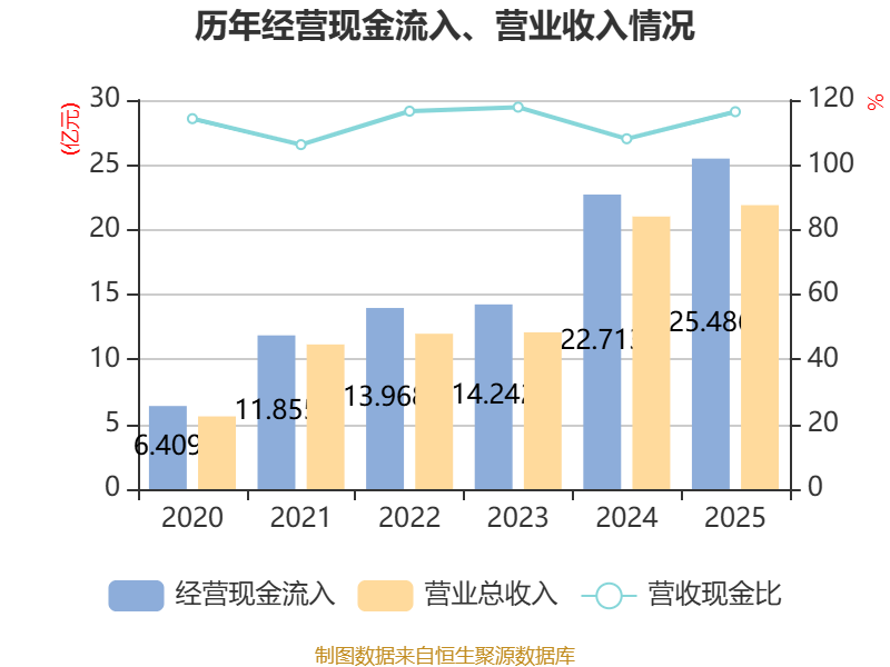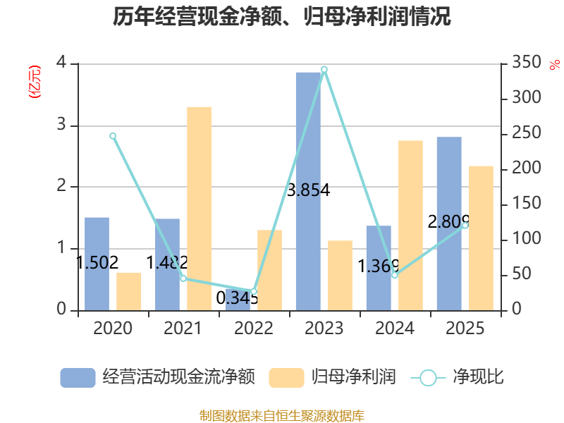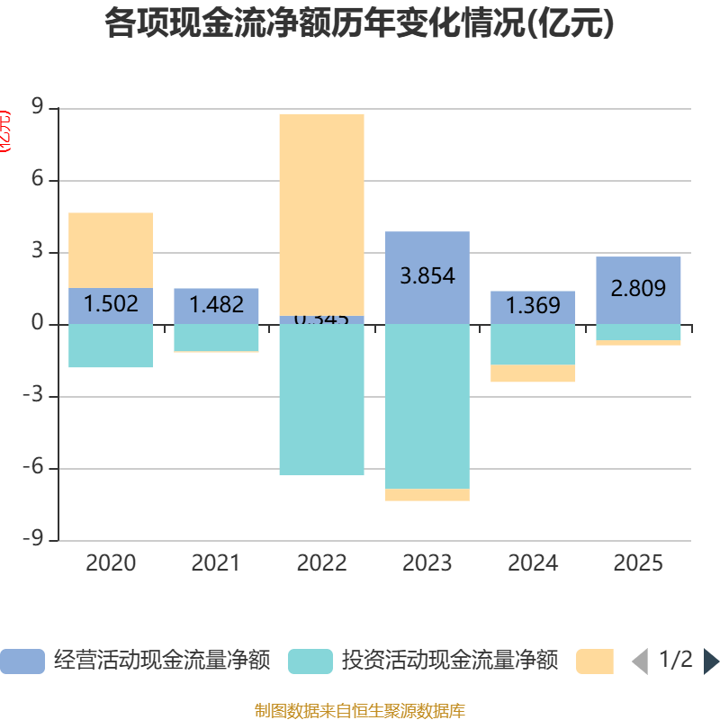 截至2025年,公司经营活动现金流净额为2.81亿元,同比增长105.11%;筹资活动现金流净额-2106.92万元,同比增加4923.08万元;投资活动现金流净额-6776.35万元,上年同期为-1.71亿元。