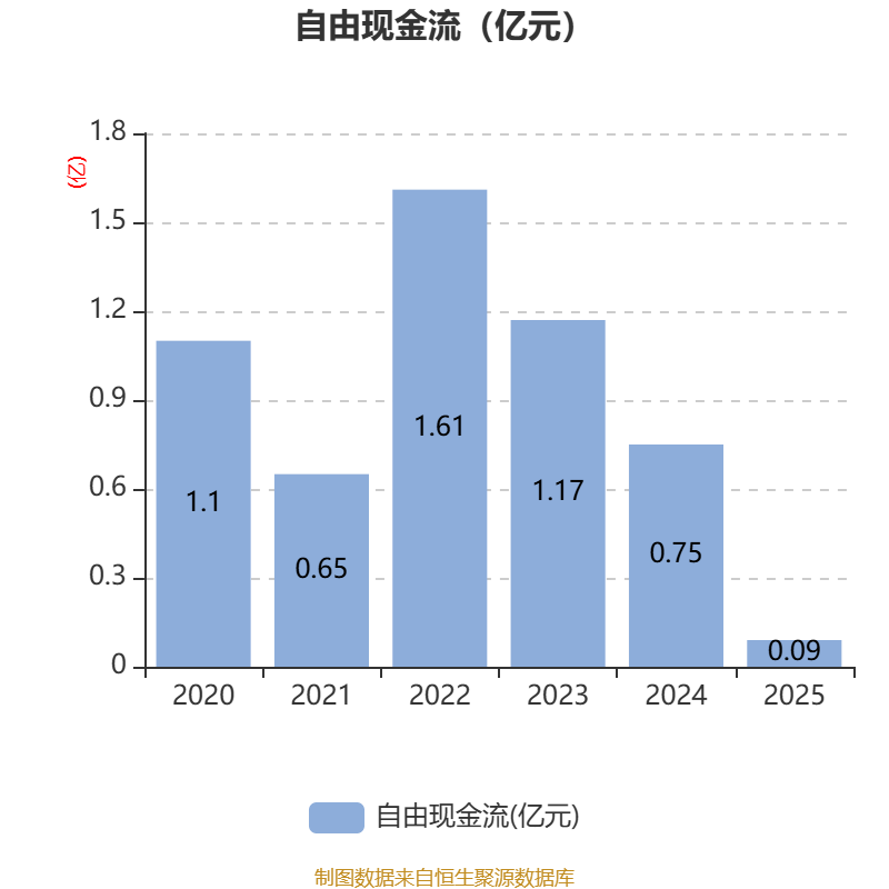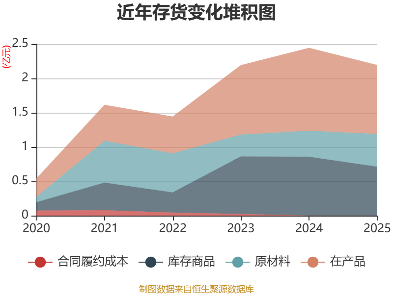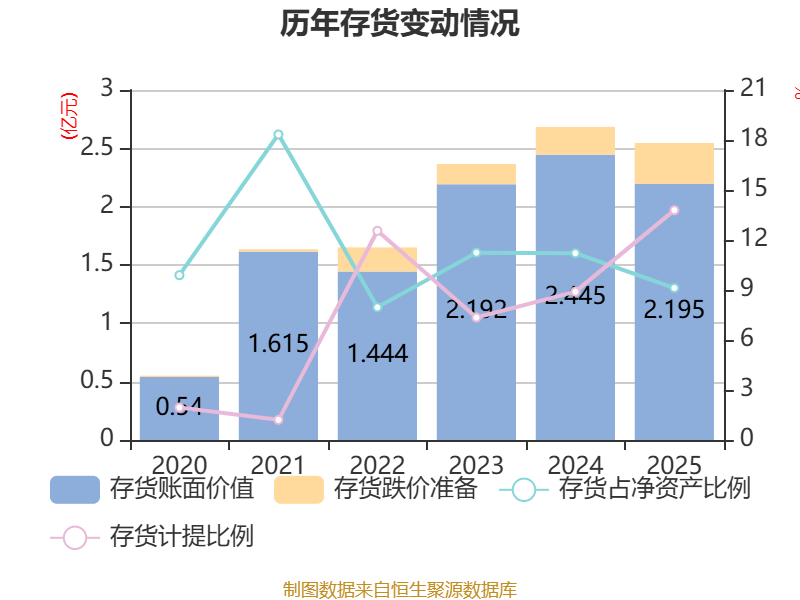 从存货变动来看,截至2025年末,公司存货账面价值为2.2亿元,占净资产的9.12%,较上年末减少2497.96万元。其中,存货跌价准备为3510.42万元,计提比例为13.79%。