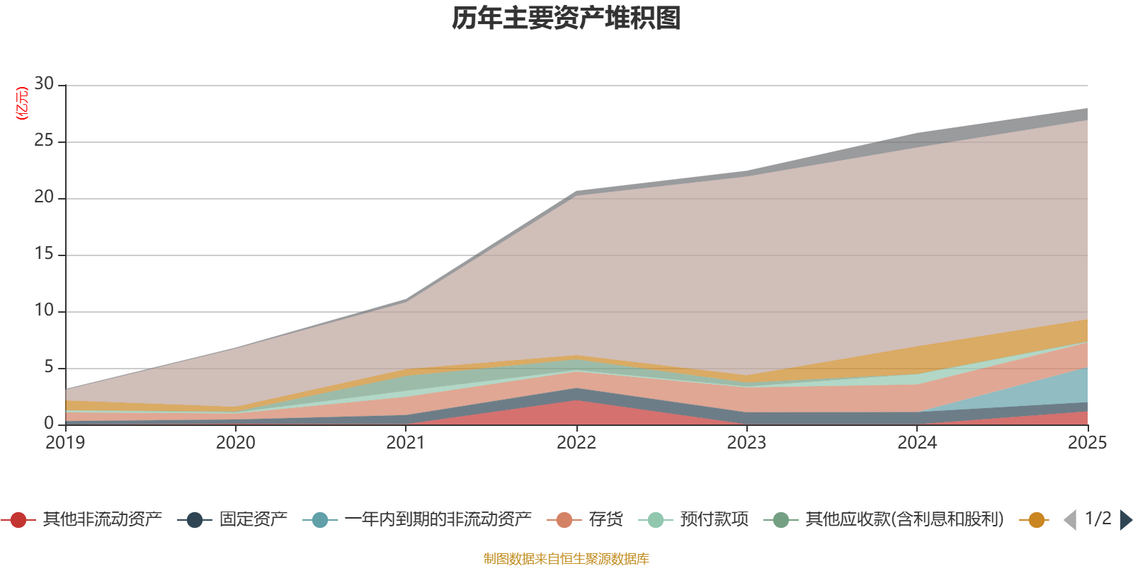 资产重大变化方面,截至2025年末,公司一年内到期的非流动资产占公司总资产的11.09%,上年末为0;货币资金较上年末增加0.09%,占公司总资产比重下降5.31个百分点;其他非流动资产较上年末增加8849.4%,占公司总资产比重上升4.09个百分点;预付款项较上年末减少92.14%,占公司总资产比重下降3.28个百分点。