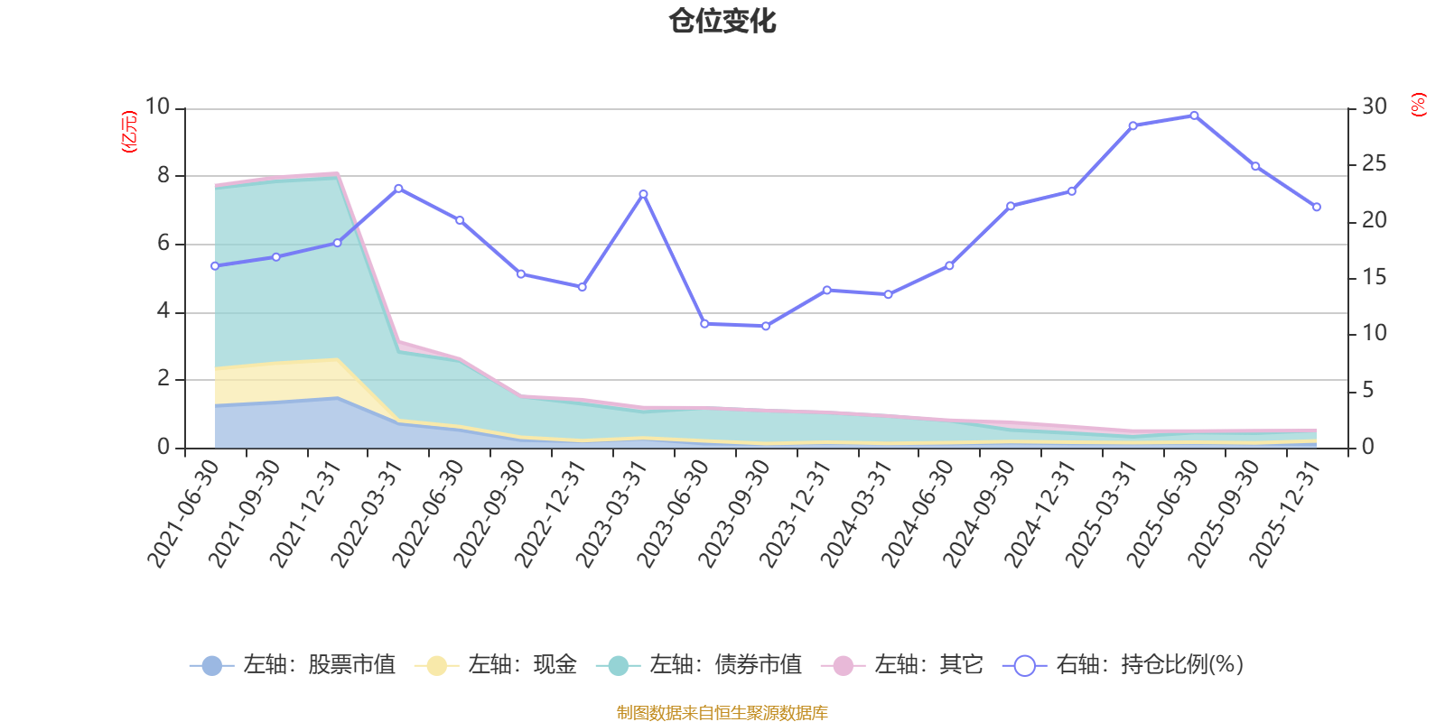 据定期报告数据统计,近三年平均股票仓位为19.66%,同类平均为19.2%。2025年上半年末基金达到29.37%的最高仓位,2023年三季度末最低,为10.77%。
