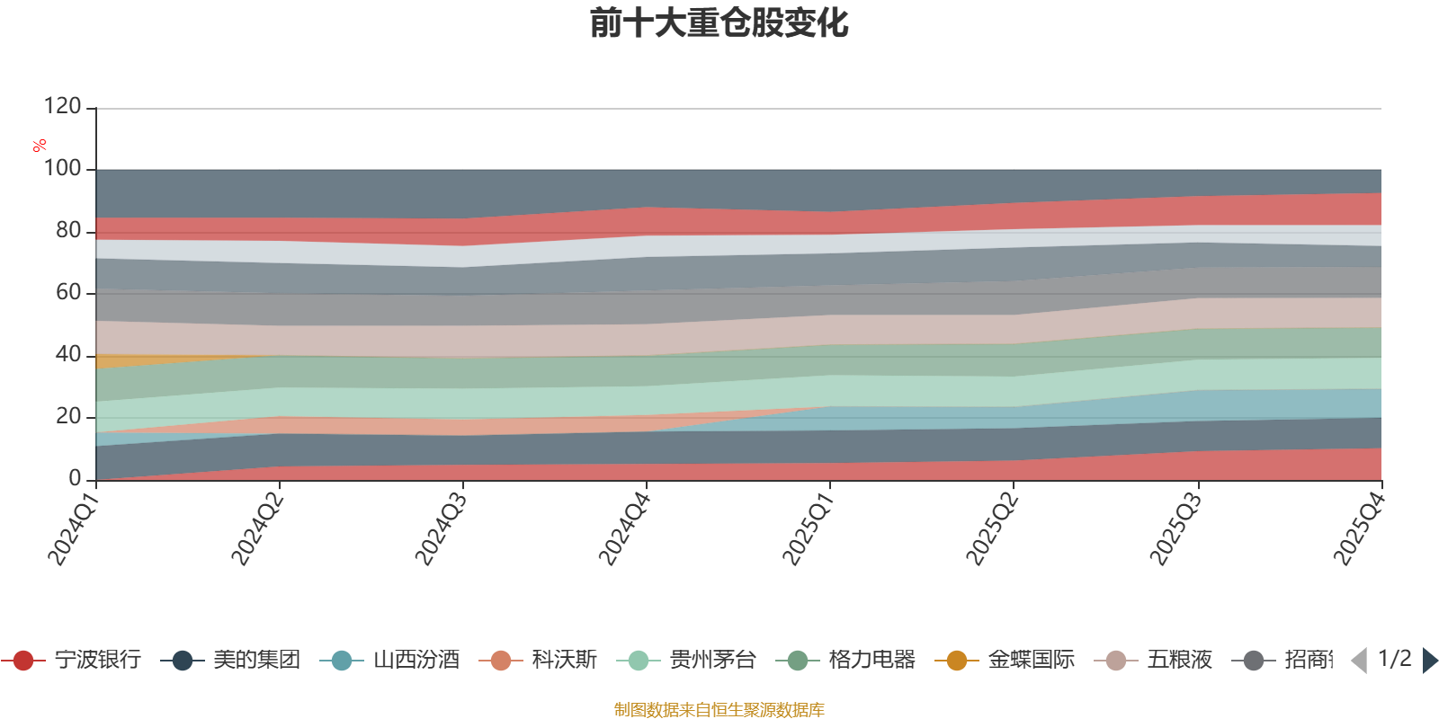 该基金持股集中度较高,且持股标的较为稳定,近2年前十大重仓股集中度长期超过60%。截至2025年末,基金十大重仓股分别是中国平安、宁波银行、贵州茅台、招商银行、美的集团、格力电器、五粮液、山西汾酒、海尔智家、中国财险。