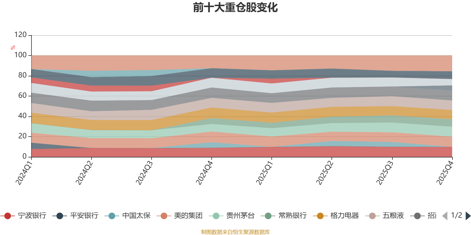 该基金持股集中度较高,且持股标的较为稳定,近2年前十大重仓股集中度长期超过60%。截至2025年末,基金十大重仓股分别是美的集团、招商银行、宁波银行、贵州茅台、五粮液、格力电器、中国平安、常熟银行、中国财险、中国国航。