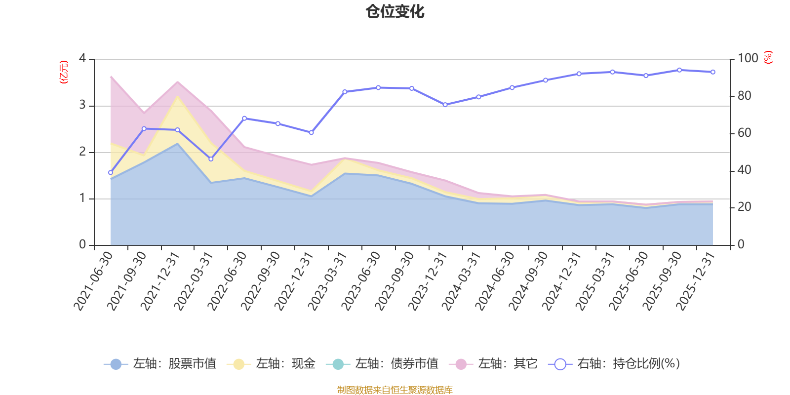 据定期报告数据统计,近三年平均股票仓位为87.02%,同类平均为84.04%。2025年三季度末基金达到94.2%的最高仓位,2021年上半年末最低,为39.06%。