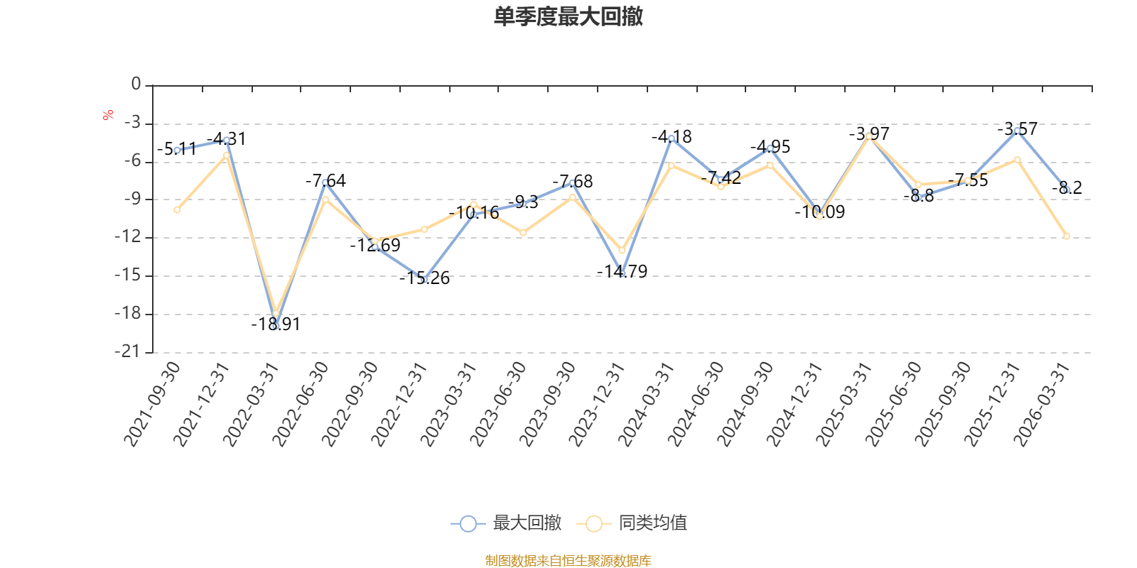 截至4月8日,基金近三年最大回撤为17.94%,同类可比基金排名2/11。单季度最大回撤出现在2022年一季度,为18.91%。