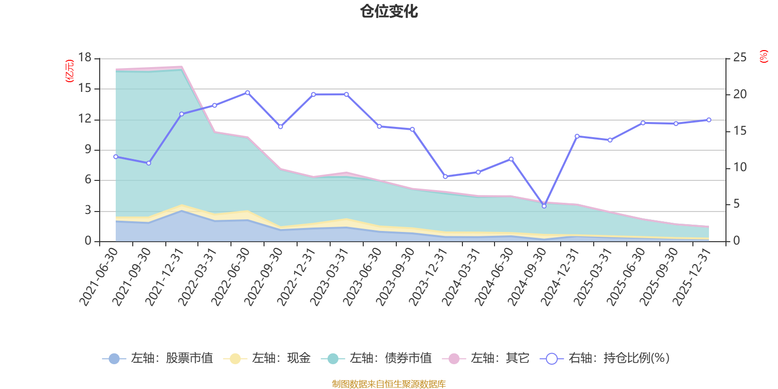 据定期报告数据统计,近三年平均股票仓位为13.55%,同类平均为19.2%。2022年上半年末基金达到20.32%的最高仓位,2024年三季度末最低,为4.82%。