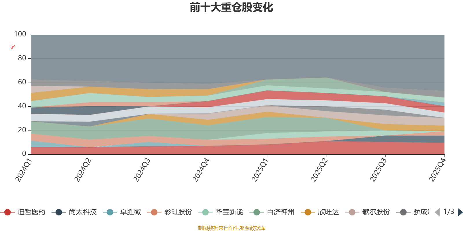 该基金持股集中度较高。截至2025年末,基金十大重仓股分别是迪哲医药、歌尔股份、尚太科技、中国中免、奥赛康、欣旺达、长春高新、汇顶科技、彩虹股份、弘元绿能。