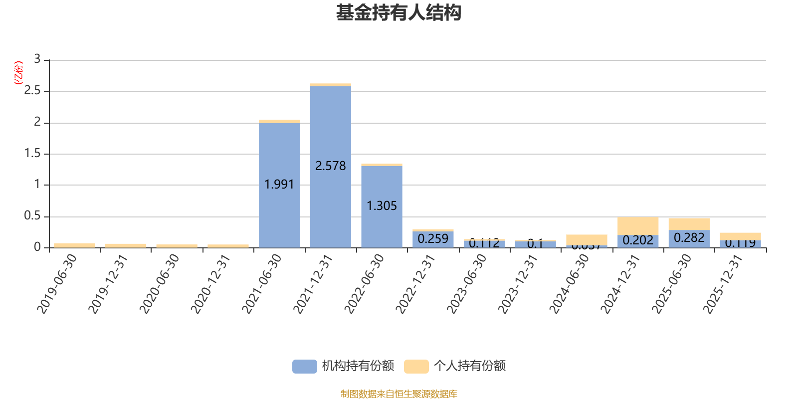 截至2025年12月31日,基金持有人共计1631户,合计持有2378.46万份。其中管理人员工持有104.22万份,占比4.38%,机构持有份额占比49.85%,个人投资者占比50.15%。