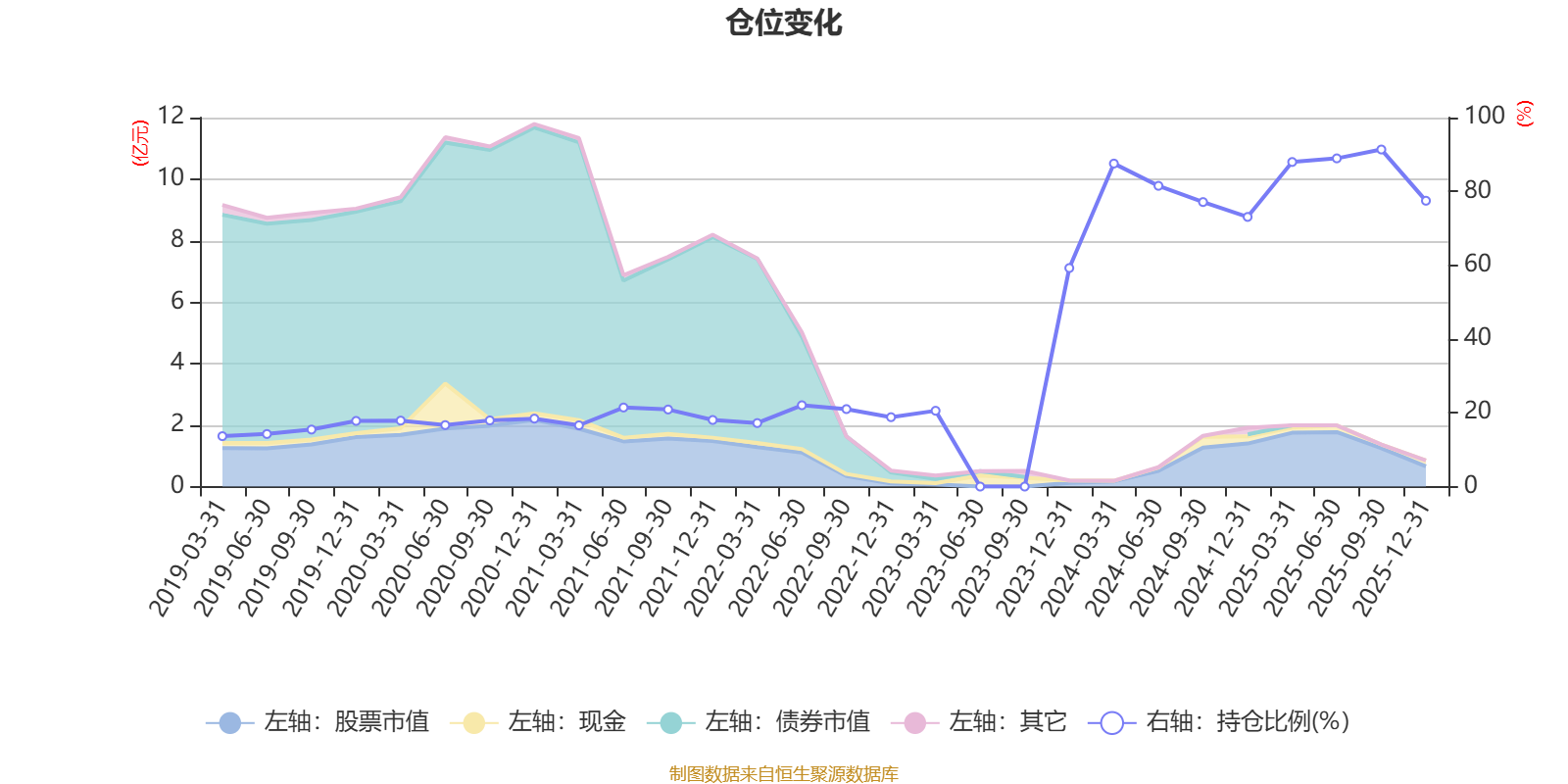 据定期报告数据统计,近三年平均股票仓位为62.06%,同类平均为72.57%。2025年三季度末基金达到91.35%的最高仓位,2019年一季度末最低,为13.66%。