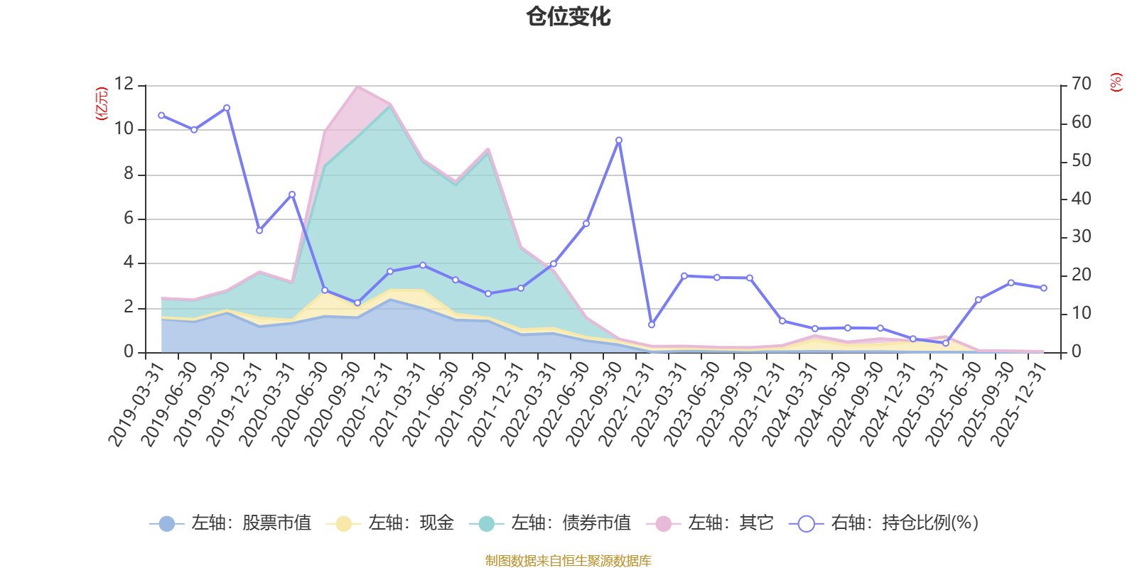 据定期报告数据统计,近三年平均股票仓位为11.8%,同类平均为72.57%。2019年三季度末基金达到64.09%的最高仓位,2025年一季度末最低,为2.45%。