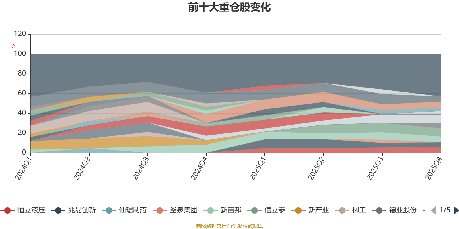 该基金持股集中度较高。截至2025年末,基金十大重仓股分别是宁德时代、信立泰、热景生物、新宙邦、恒立液压、德业股份、惠泰医疗、兆易创新、悦康药业、鼎胜新材。