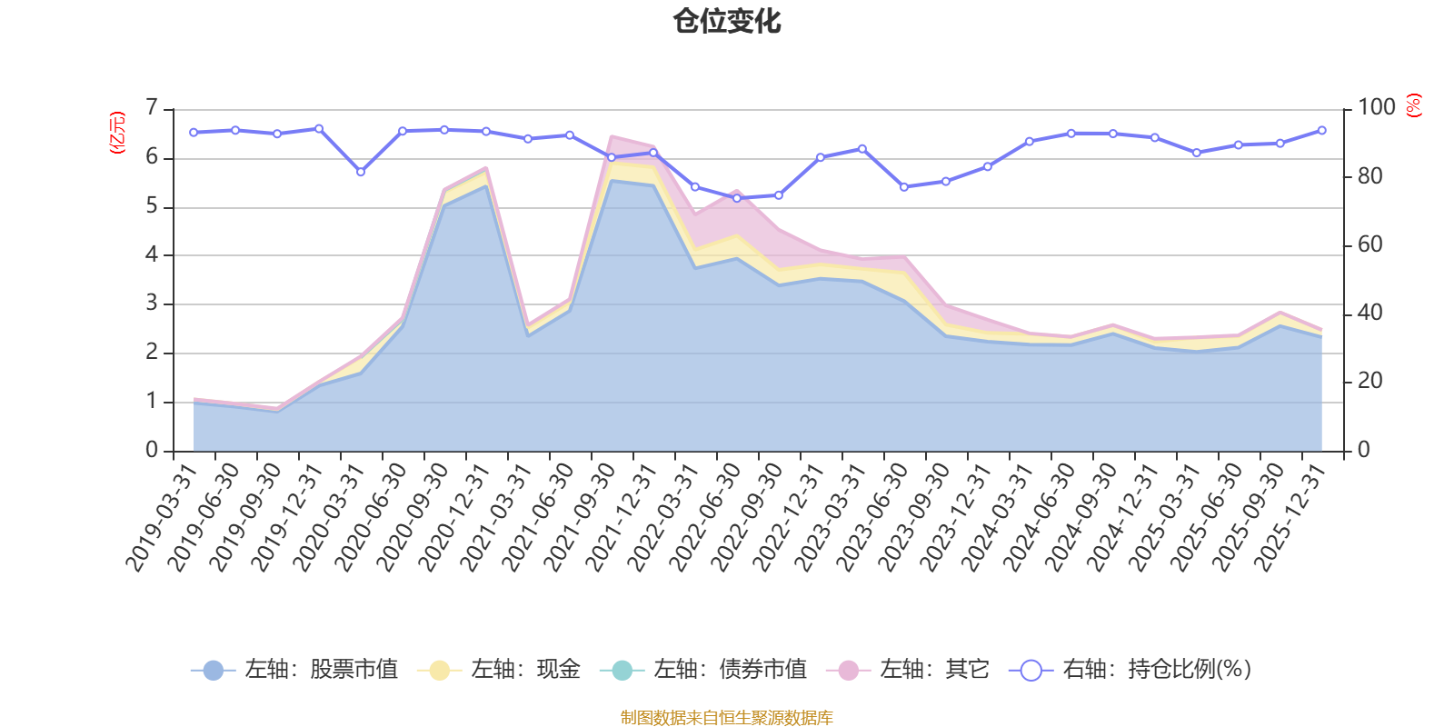 据定期报告数据统计,近三年平均股票仓位为88%,同类平均为72.57%。2019年末基金达到94.27%的最高仓位,2022年上半年末最低,为73.93%。