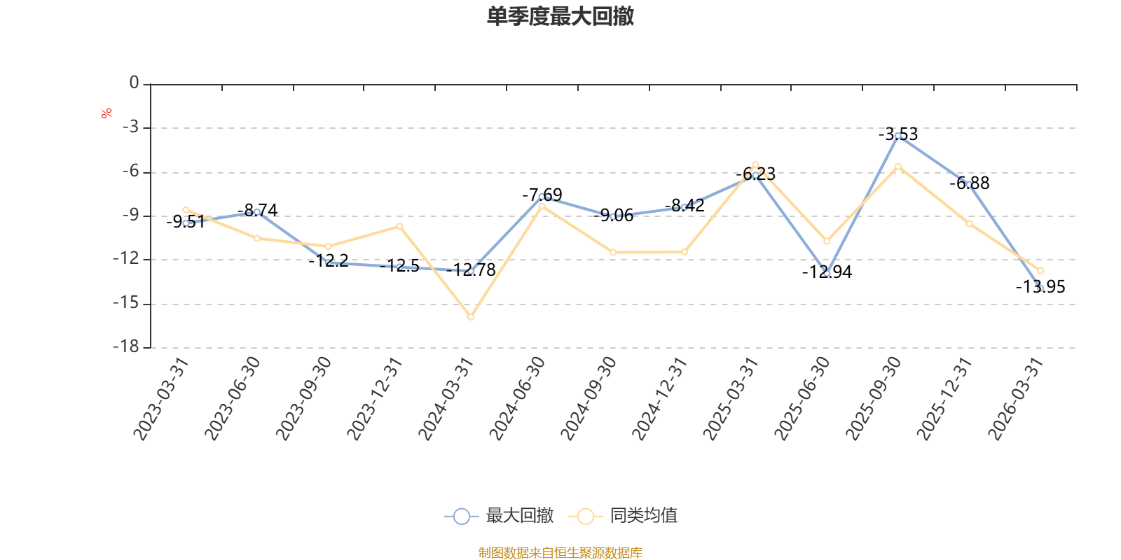 截至4月8日,基金近三年最大回撤为27.54%,同类可比基金排名44/157。单季度最大回撤出现在2026年一季度,为13.95%。