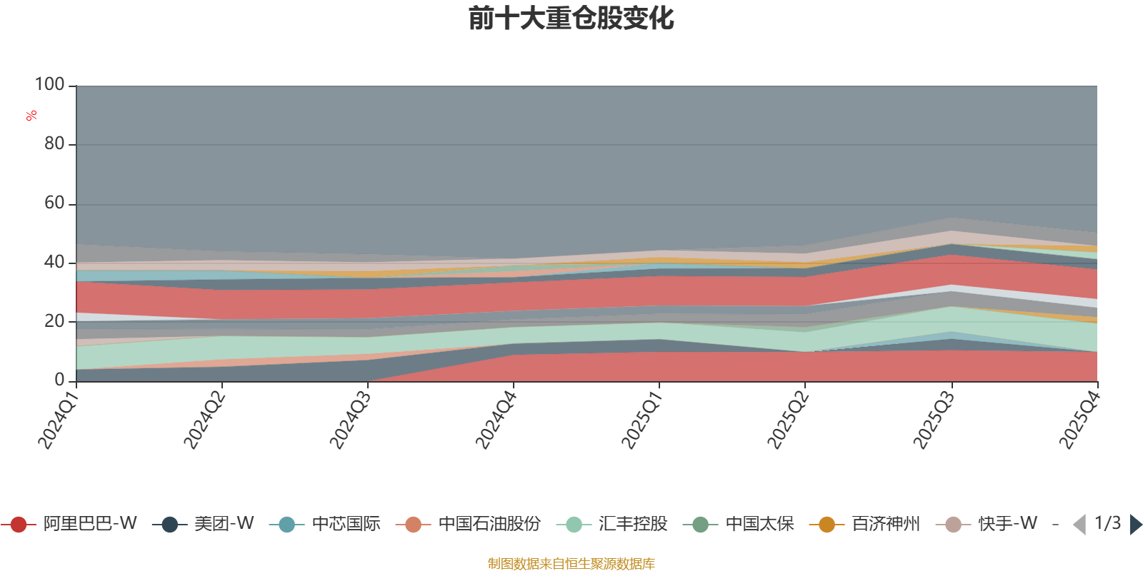 截至2025年末,基金十大重仓股分别是腾讯控股、阿里巴巴-W、汇丰控股、友邦保险、香港交易所、小米集团-W、中国海洋石油、保诚、百济神州、中国人寿。