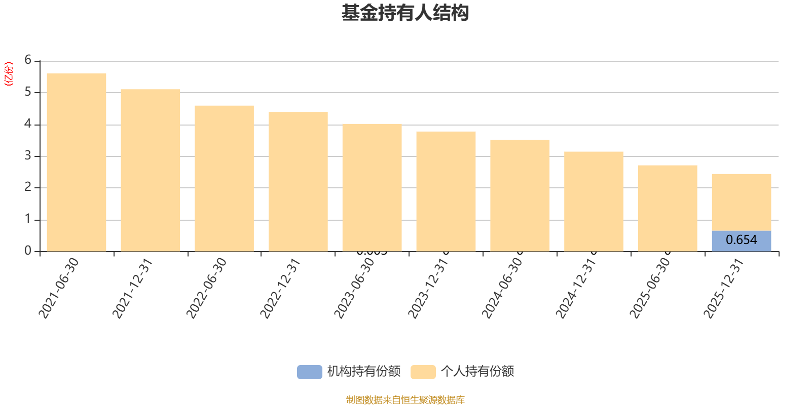 截至2025年12月31日,基金持有人共计3.15万户,合计持有2.43亿份。其中管理人员工持有27.29万份,占比0.11%,机构持有份额占比26.89%,个人投资者占比73.11%。