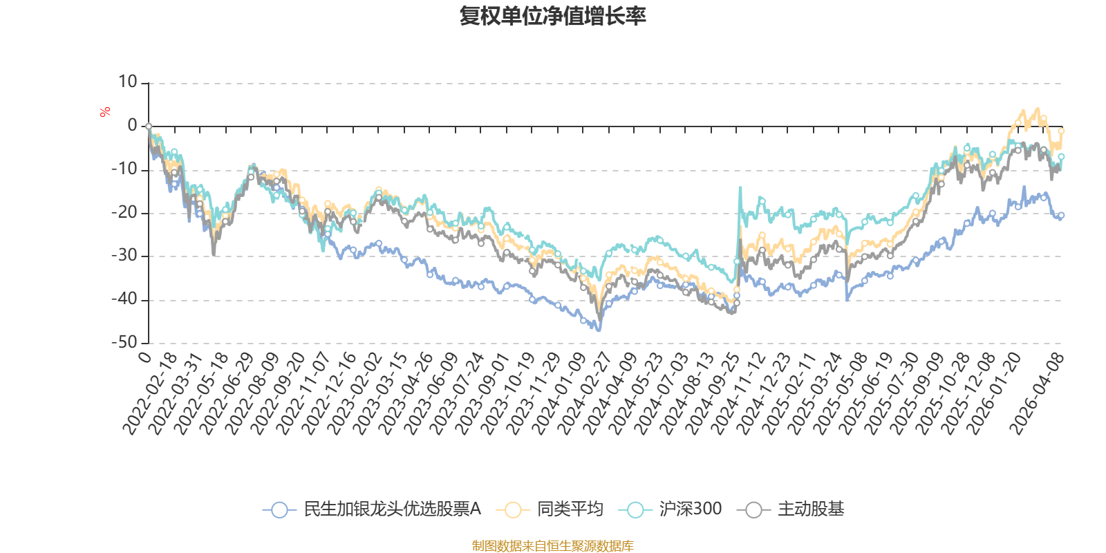 截至4月8日,民生加银龙头优选股票A近三个月复权单位净值增长率为-2.62%,位于同类可比基金112/167;近半年复权单位净值增长率为6.41%,位于同类可比基金65/167;近一年复权单位净值增长率为30.92%,位于同类可比基金114/165;近三年复权单位净值增长率为14.15%,位于同类可比基金103/157。