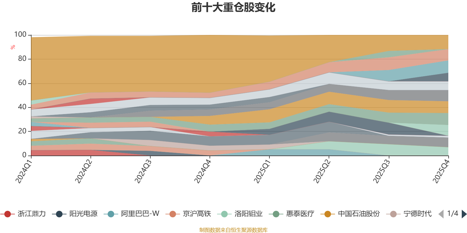 截至2025年末,基金十大重仓股分别是招商银行、中国海洋石油、腾讯控股、紫金矿业、美的集团、中国人保、工商银行、中国移动、中国铝业、洛阳钼业、中国海油。